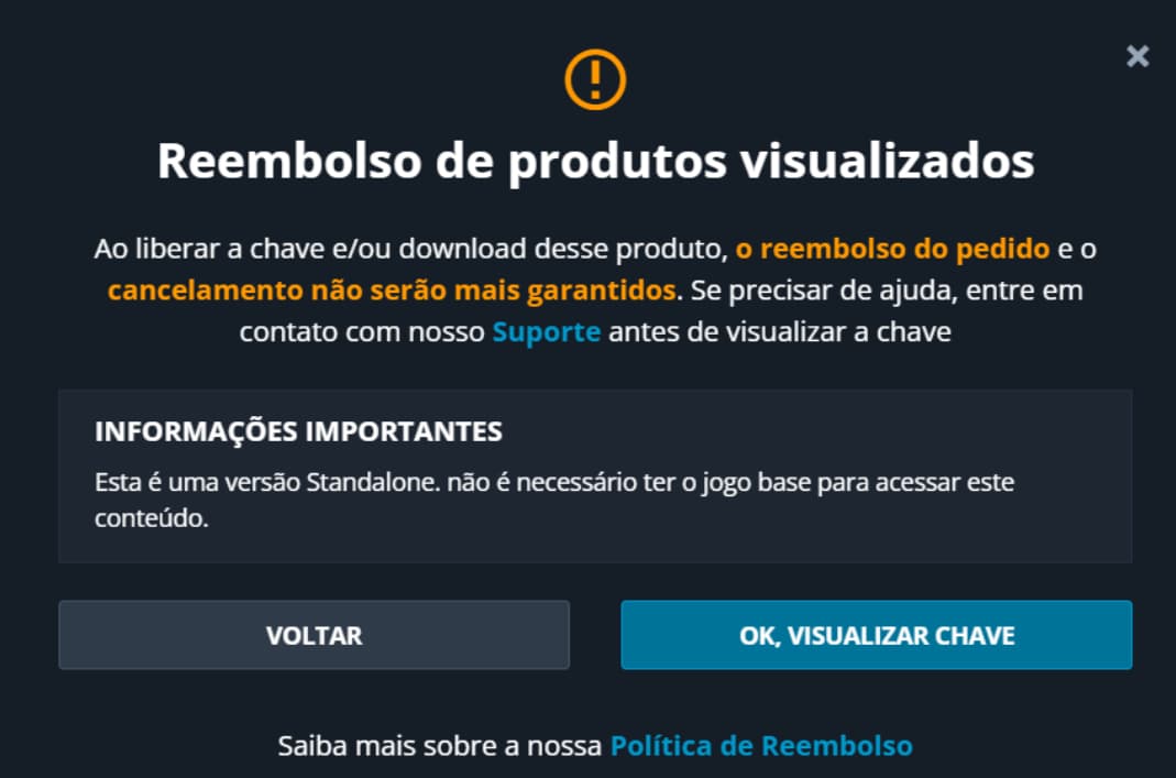 Antes de visualizar a chave de ativação do jogo/gift card, uma mensagem de aviso reforçará as particularidades do produto e solicitará sua confirmação para visualizar o código.